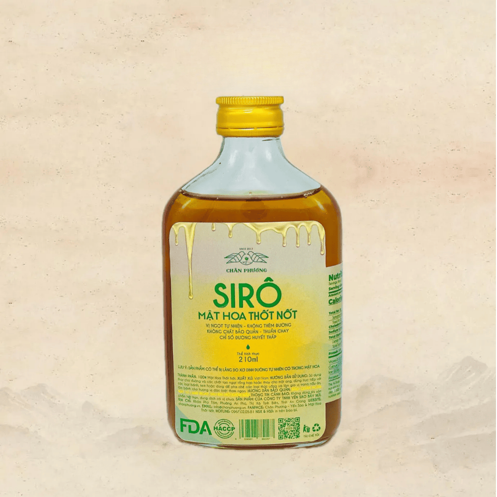 Siro Mật Hoa Thốt Nốt – tinh hoa từ vùng Bảy Núi, An Giang – được chiết xuất từ những giọt mật nguyên chất thu hoạch thủ công từ hoa thốt nốt bằng kỹ thuật massage truyền thống của người Khmer. Sản phẩm giữ trọn hương vị ngọt thanh, dịu nhẹ, hoàn toàn 100% tự nhiên, không thêm đường, không chất bảo quản, giàu khoáng chất thiết yếu và có chỉ số đường huyết thấp, phù hợp cho cả trẻ em, người lớn tuổi và người quan tâm đến sức khỏe.