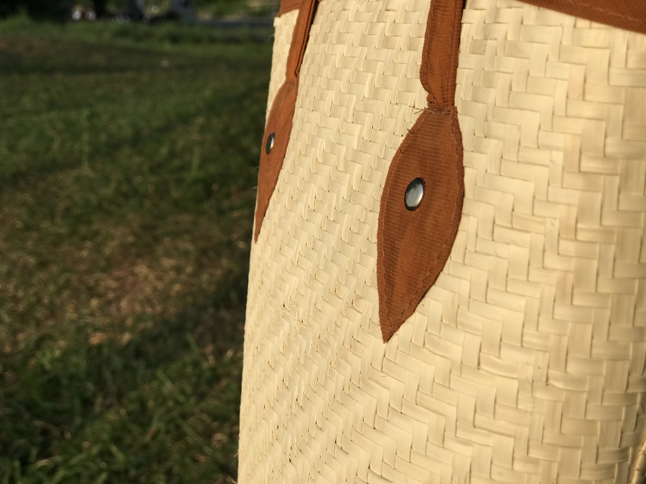 - Lớp bên ngoài được đan chắc chắn bằng cỏ bàng, những đường đan chi tiết tỉ mỉ, được làm thủ công bởi các nghệ nhân là người dân địa phương. Vì lớp ngoài là lớp cỏ khô nên nó rắn chắc, đàn hồi tốt, được thiết kế để làm bộ khung cho giỏ. Đường chỉ may ngay ngắn, ngăn nắp, đồng đều. Màu chỉ được lựa chọn, hài hoà với tổng thể màu của giỏ, không bị chõi màu. Cho nên, lớp vỏ ngoài của balo được ví như người phụ nữ Việt Nam rắn rỏi, bất khuất.