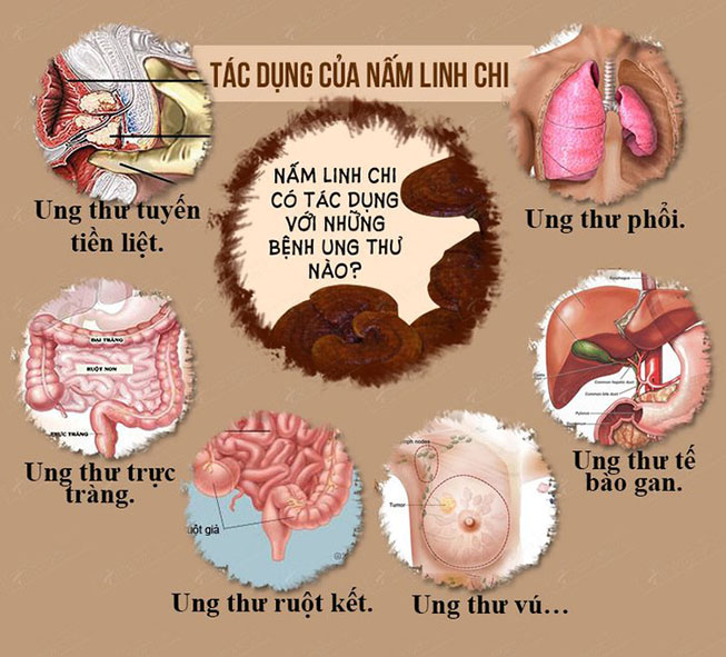 - Nấm linh chi có tác dụng đối với bệnh ung thư giúp bệnh nhân ung thư sau giai đoạn hóa trị, xạ trị khi phối hợp với Linh chi sẽ cải thiện hồng cầu, bạch cầu, huyết sắc tố. Linh chi giúp khử các gốc tự do, bảo vệ màng tế bào, ngừa di căn cơ quan khác.
