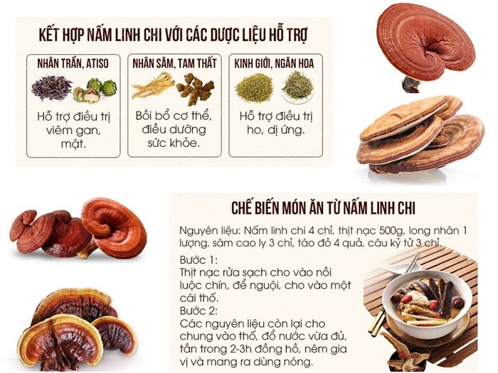 Ngoài ra, còn có cách chế biến nấm linh chi thành các món ăn sẽ rất thơm ngon bổ dưỡng, thích hợp cho mọi người, đặc biệt với những người mới ốm dậy và người già yếu.