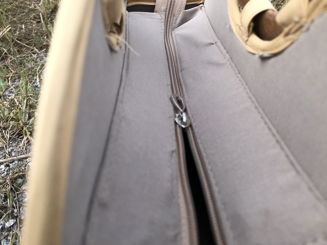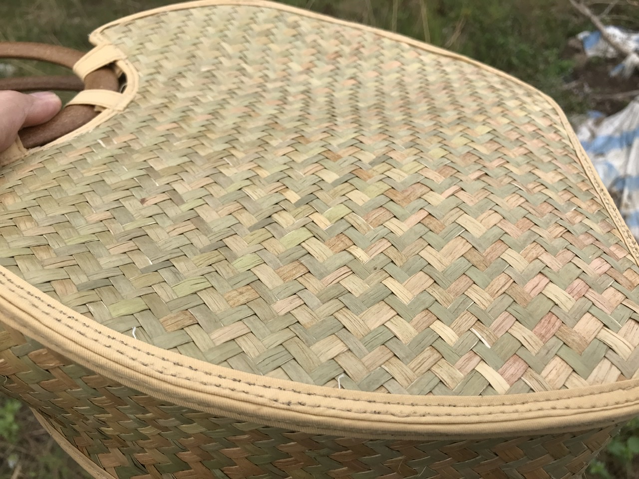 - Lớp bên ngoài được đan chắc chắn bằng cỏ bàng, những đường đan chi tiết tỉ mỉ, được làm thủ công bởi các nghệ nhân là người dân địa phương. Vì lớp ngoài là lớp cỏ khô nên nó rắn chắc, đàn hồi tốt, được thiết kế để làm bộ khung cho giỏ. Đường chỉ may ngay ngắn, ngăn nắp, đồng đều. Màu chỉ được lựa chọn, hài hoà với tổng thể màu của giỏ, không bị chõi màu. Cho nên, lớp vỏ ngoài của giỏ được ví như người phụ nữ Việt Nam rắn rỏi.