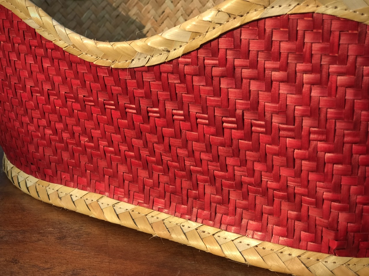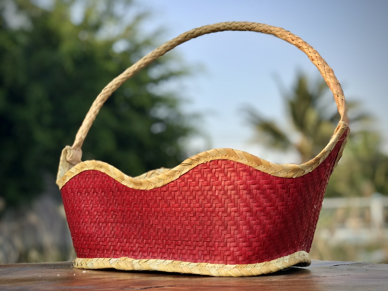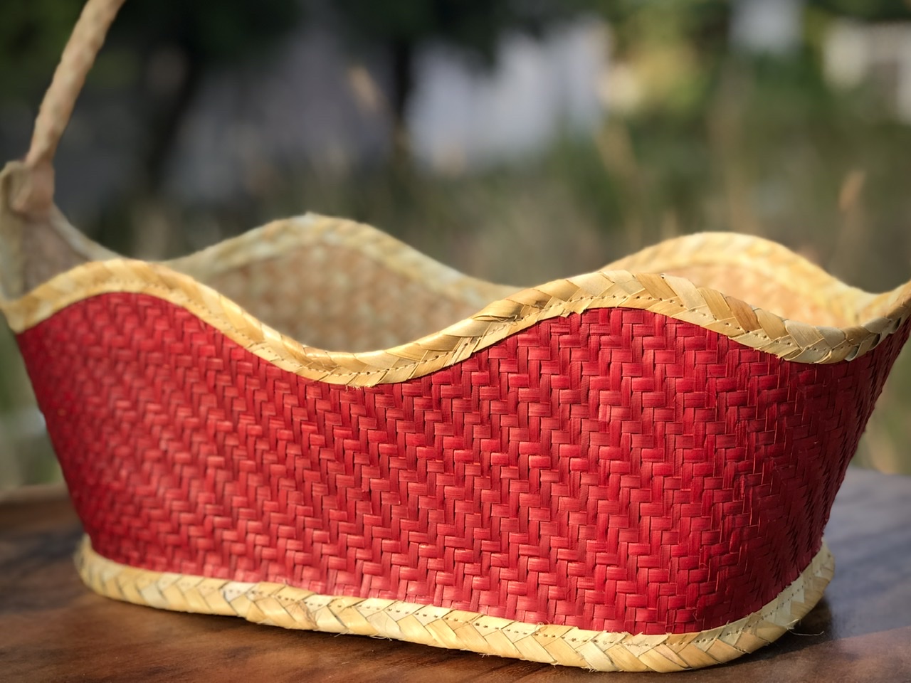 Ngoài ra, điểm nhấn của giỏ quà nằm ở màu sắc đỏ làm nổi bật lên sự trẻ trung, sang trọng của giỏ. Viền của giỏ được các nghệ nhân tạo hình uốn cong, tạo nên sự mềm mại của giỏ.